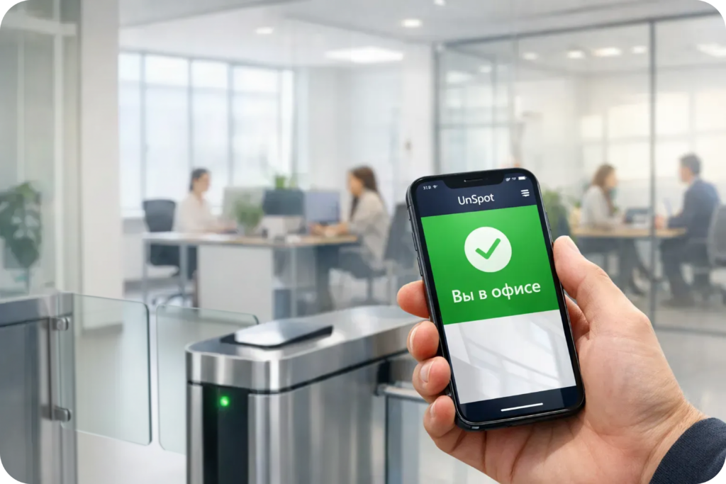 Приложение UnSpot – инструмент сотрудника для входа в офис. Телефон заменяет физический пропуск: вход осуществляется через приложение и СКУД, без пластиковых карт.