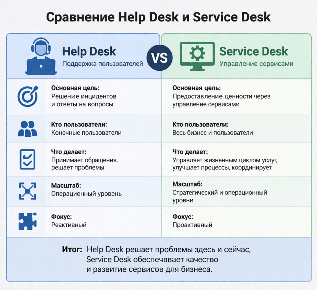 Но у help desk есть предел. Он в основном закрывает текущую проблему, а не управляет сервисом в целом. Поэтому help desk и service desk не равны по глубине.