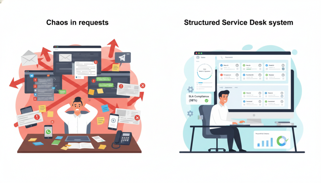 В 2024-2026 такой формат уже плохо работает. Чем больше в компании пользователей, внутренних команд и сервисных сценариев, тем выше риск, что ручное управление обращениями начнет тормозить процессы. Именно поэтому service desk становится не просто удобным интерфейсом, а важной частью операционной среды.