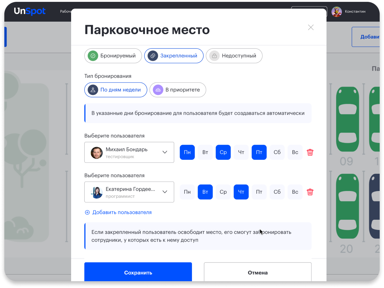 Определённые парковочные места можно закрепить за сотрудником или отделом.