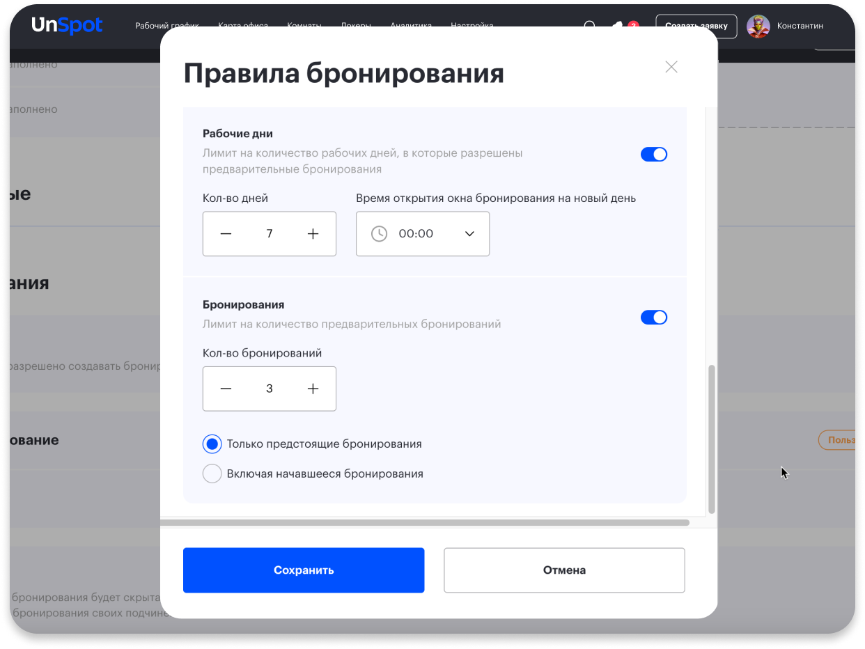 Вы задаете правила: на сколько дней вперёд можно ставить брони, сколько активных бронирований может иметь один сотрудник.