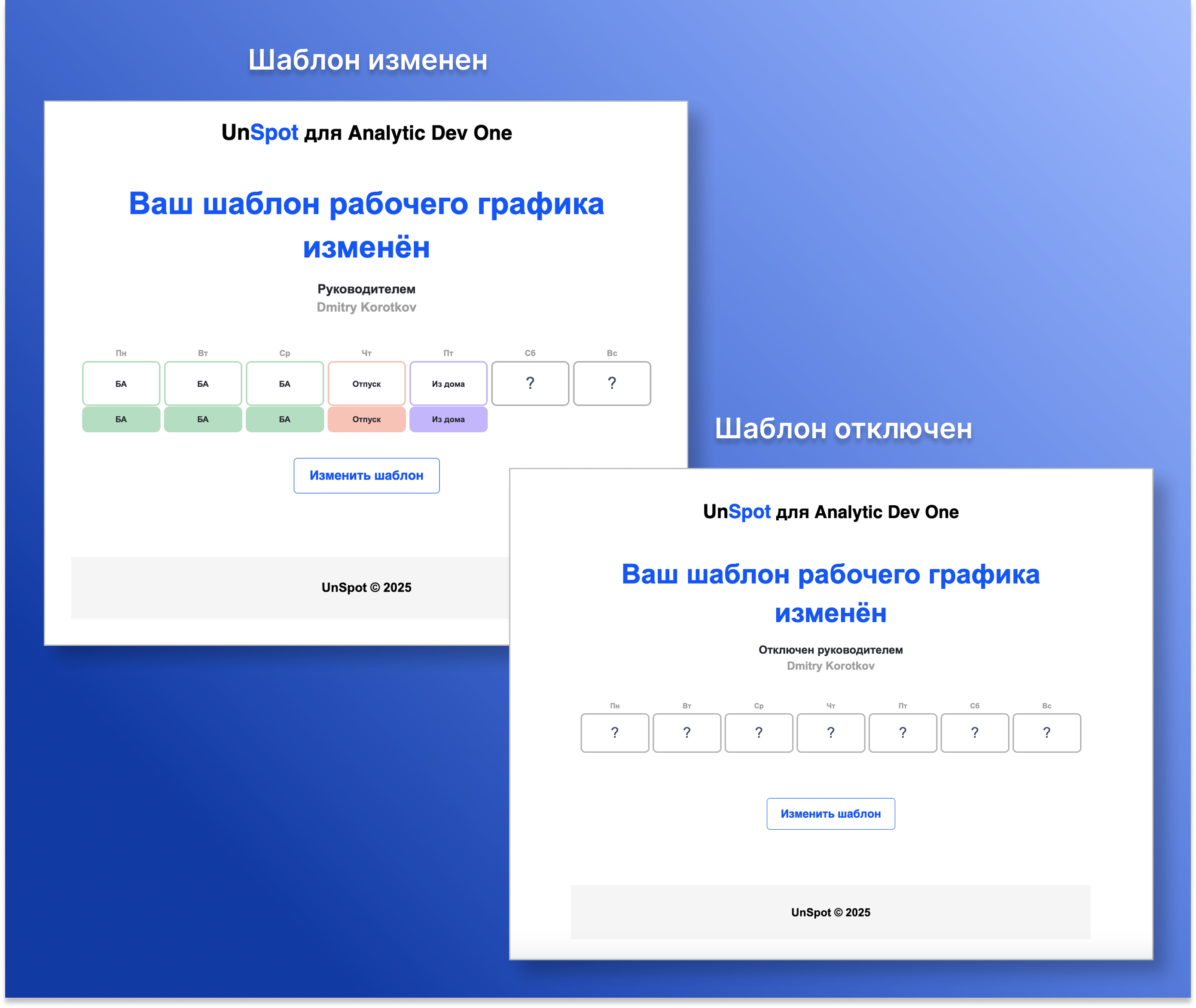 Также обновили верстку письма: ячейки показывают только актуальные статусы, блок с информацией о руководителе отражает корректное действие («изменено» или «отключено»), дни недели и кнопка «Изменить шаблон» оформлены в соответствии с новым дизайном.