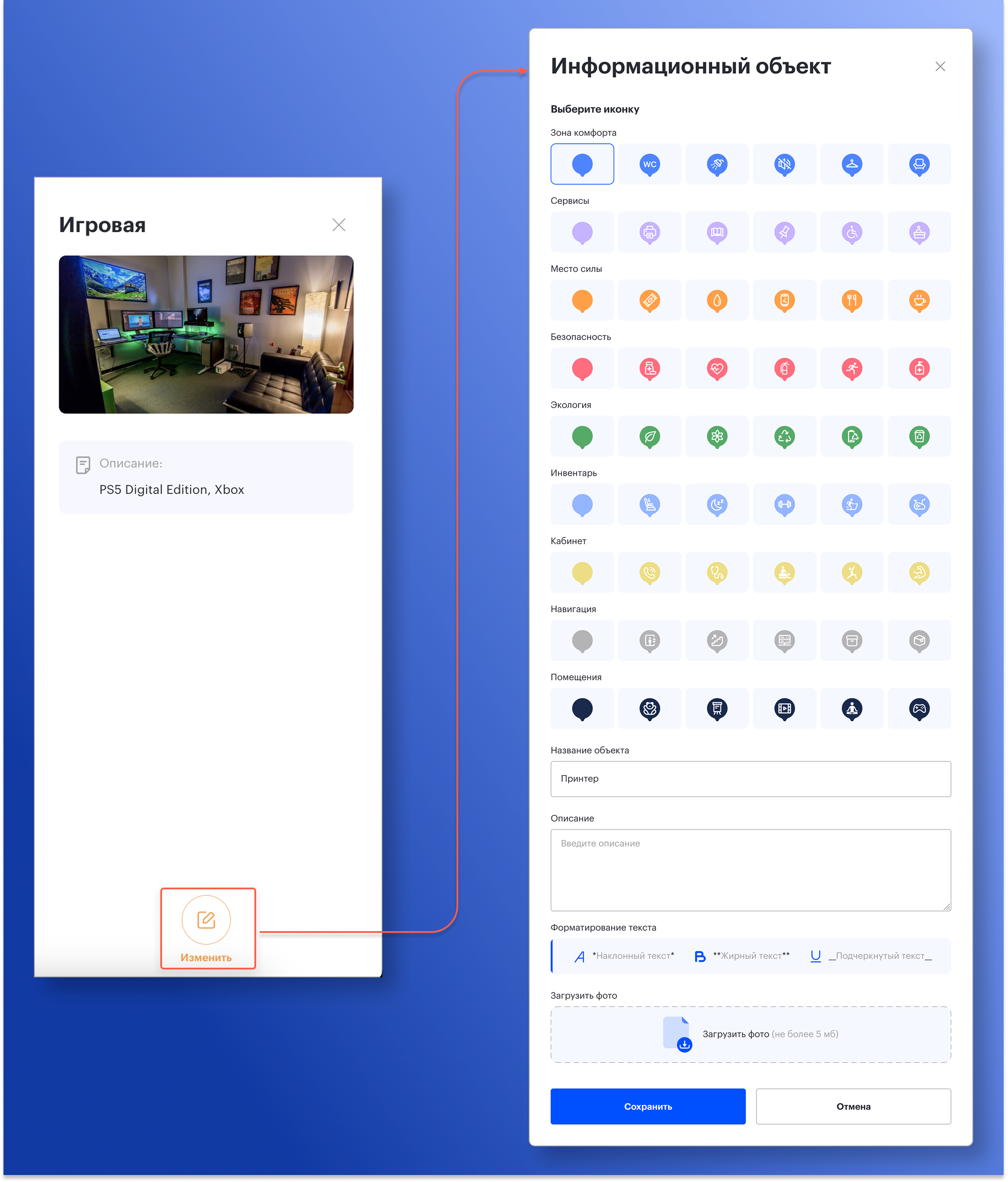 Это ускоряет работу с объектами: чтобы обновить название, описание или иконку, больше не нужно переключаться в отдельный режим и заново искать нужную точку на карте — изменения вносятся “на месте”, а после сохранения карточка сразу отображает актуальные данные. В итоге поддерживать актуальную информацию на карте офиса стало проще и быстрее.