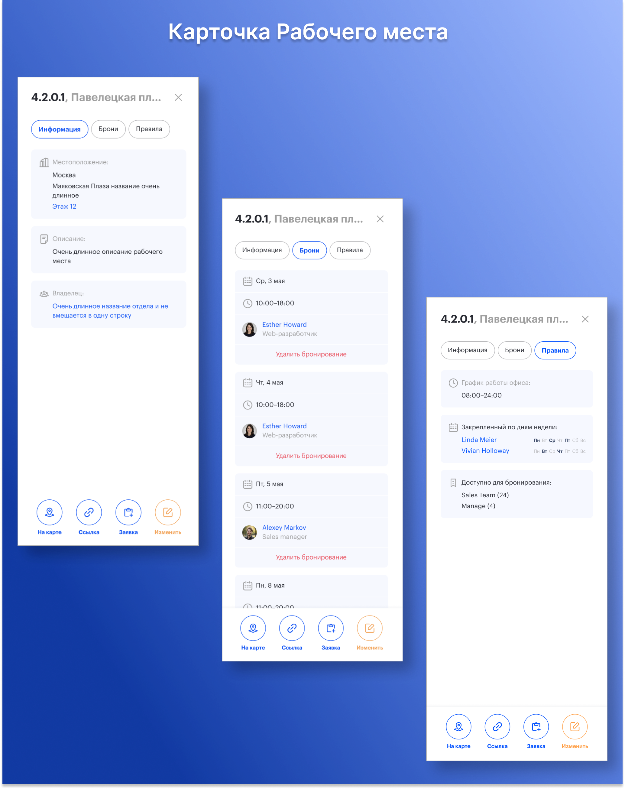 Вся информация о рабочем столе или парковочном месте теперь доступна в боковой панели, которая открывается из любой точки интерфейса. Это упрощает работу с ресурсами: вы сразу видите, где находится объект, доступен ли он для бронирования и какие правила к нему применяются — без переходов между разделами.