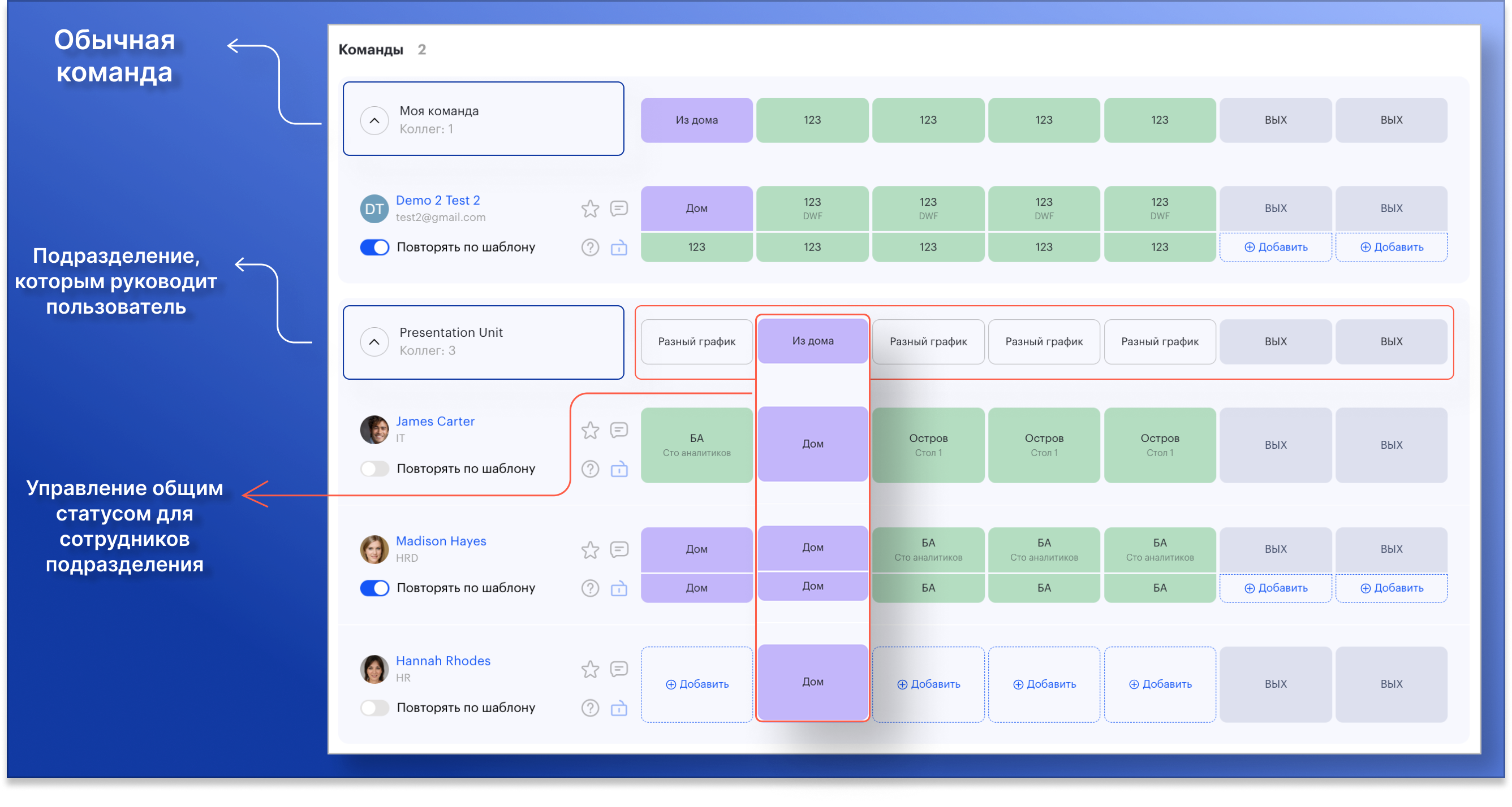 Также обновлена логика смены статусов: можно изменять общий и индивидуальный статус как для обычных команд, так и для подразделений. Система определяет, с каким типом команды вы работаете, и управление статусами остаётся простым и наглядным.