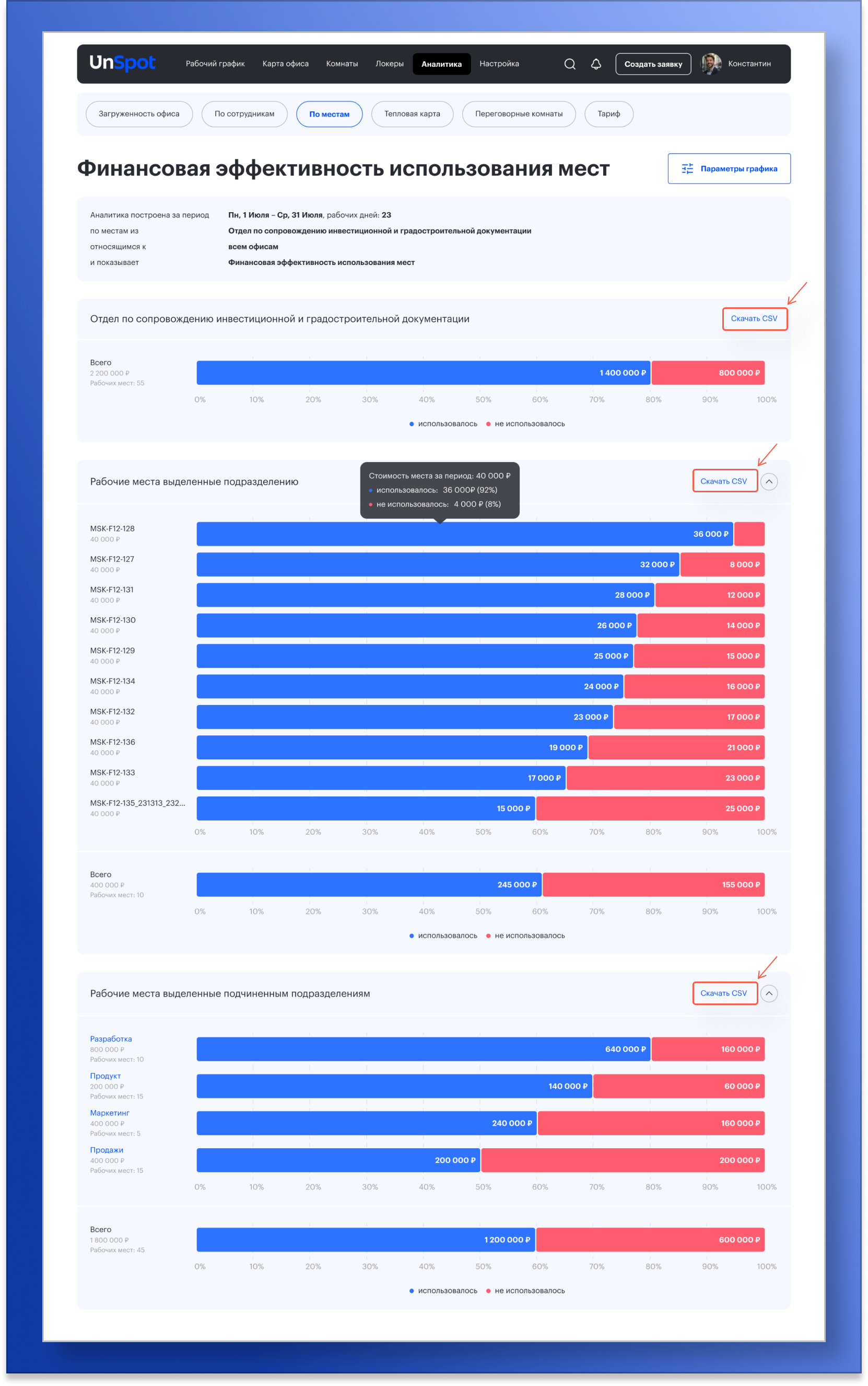 Для каждого блока доступна выгрузка CSV-отчета по выбранным фильтрам, с полными данными по количеству мест, стоимости и проценту занятости. Значения полностью соответствуют графику и учитывают валюту компании.