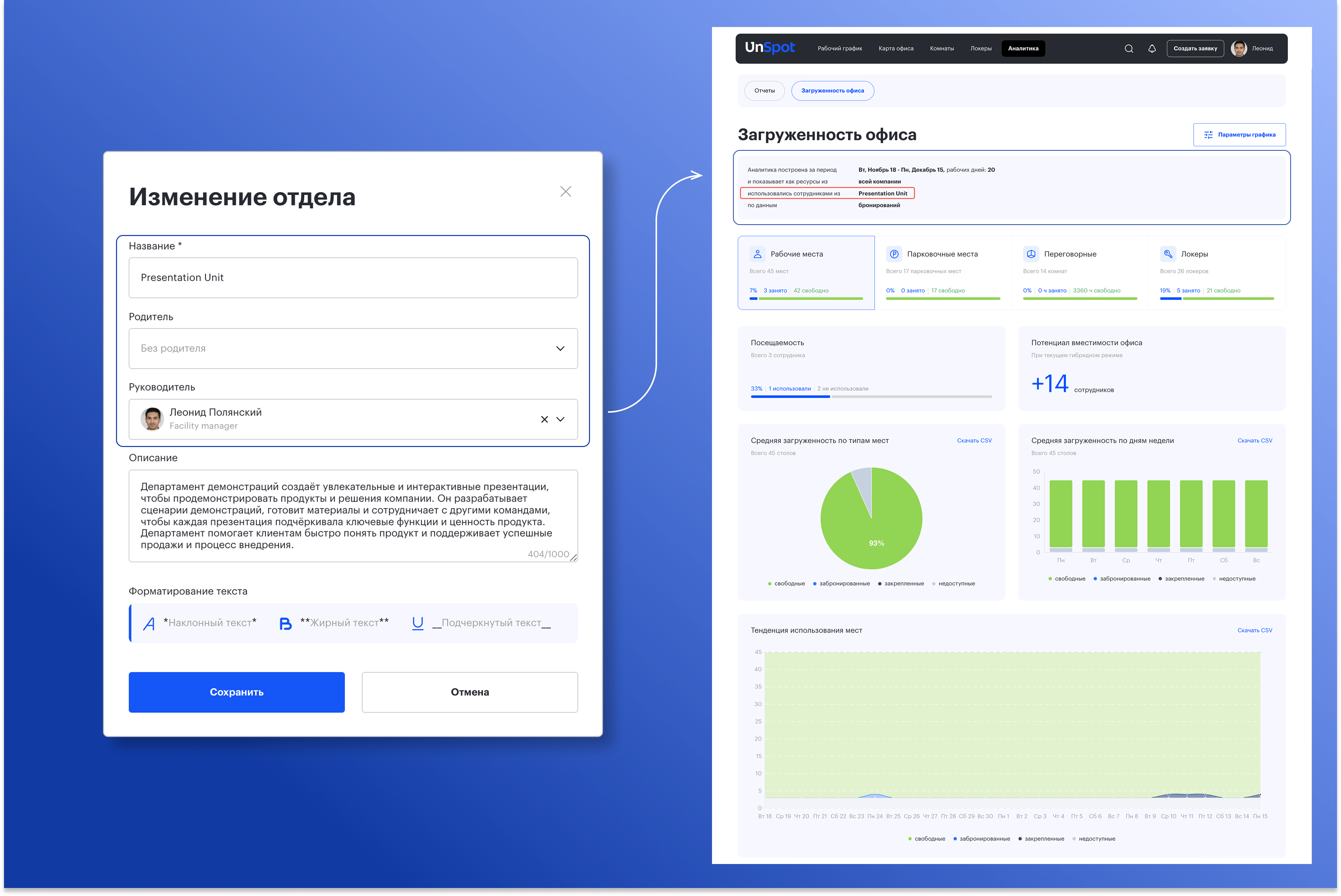 Руководители подразделений видят графики загруженности офиса только по своим командам и подчинённым отделам: фильтрация применяется автоматически и учитывает сотрудников и подразделения во всей иерархии, без возможности выбора данных за пределами своей зоны ответственности.