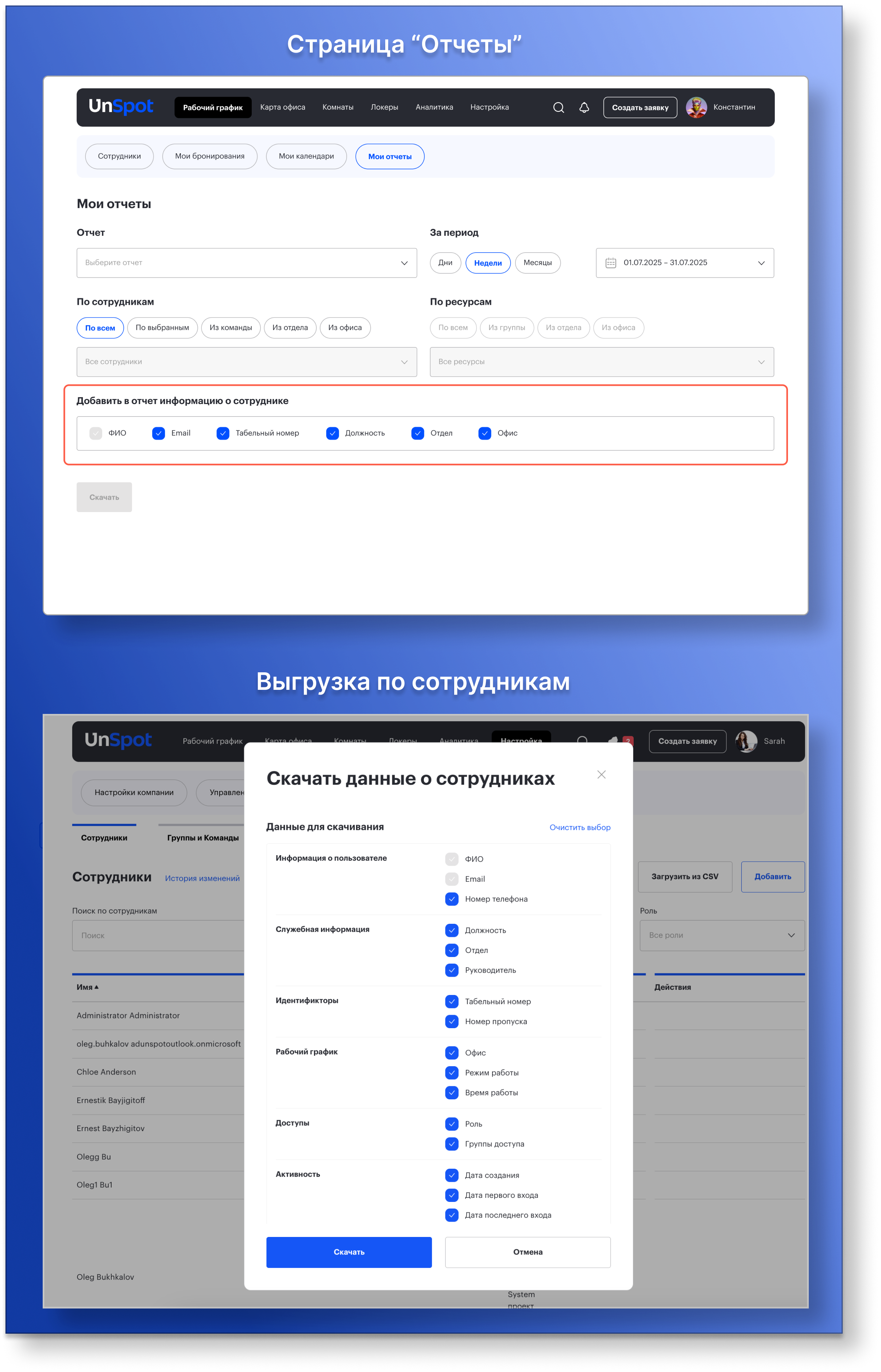 В отчетах и при выгрузке данных о сотрудниках теперь доступна пользовательская настройка полей, которые будут отображаться в скачанном файле. Это помогает формировать релевантные выгрузки именно под ваши задачи.
