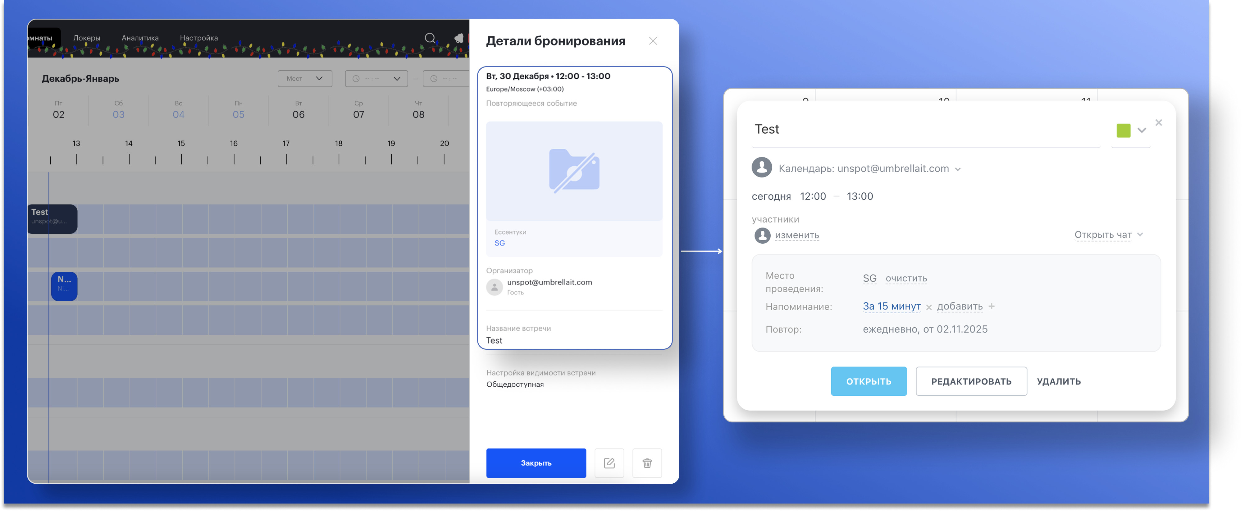 Поддерживаются как разовые встречи, так и повторяющиеся бронирования. При необходимости можно изменить отдельное событие из всей цепочки повторений, не затрагивая остальные, — это делает работу с календарём гибкой и помогает избежать конфликтов при бронировании переговорных.