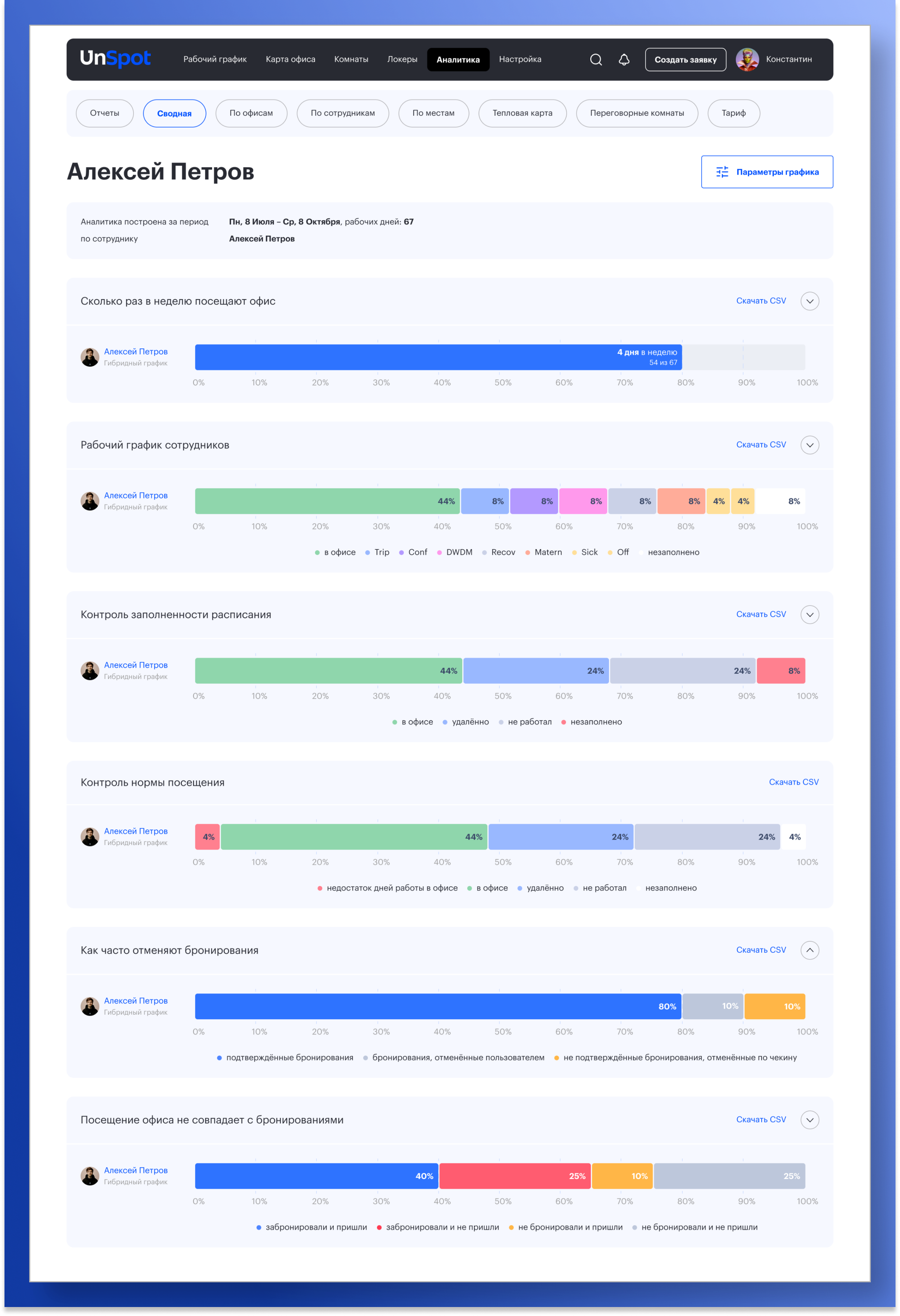 В UnSpot появилась новая аналитика в разрезе по сотруднику, страница «Сводная», на которой собраны шесть аналитических графиков, отражающих ключевые показатели по расписанию, бронированиям и фактическому посещению офиса. Она позволяет быстро оценить, как сотрудники работают и используют офис – как по себе, так и по своей команде.