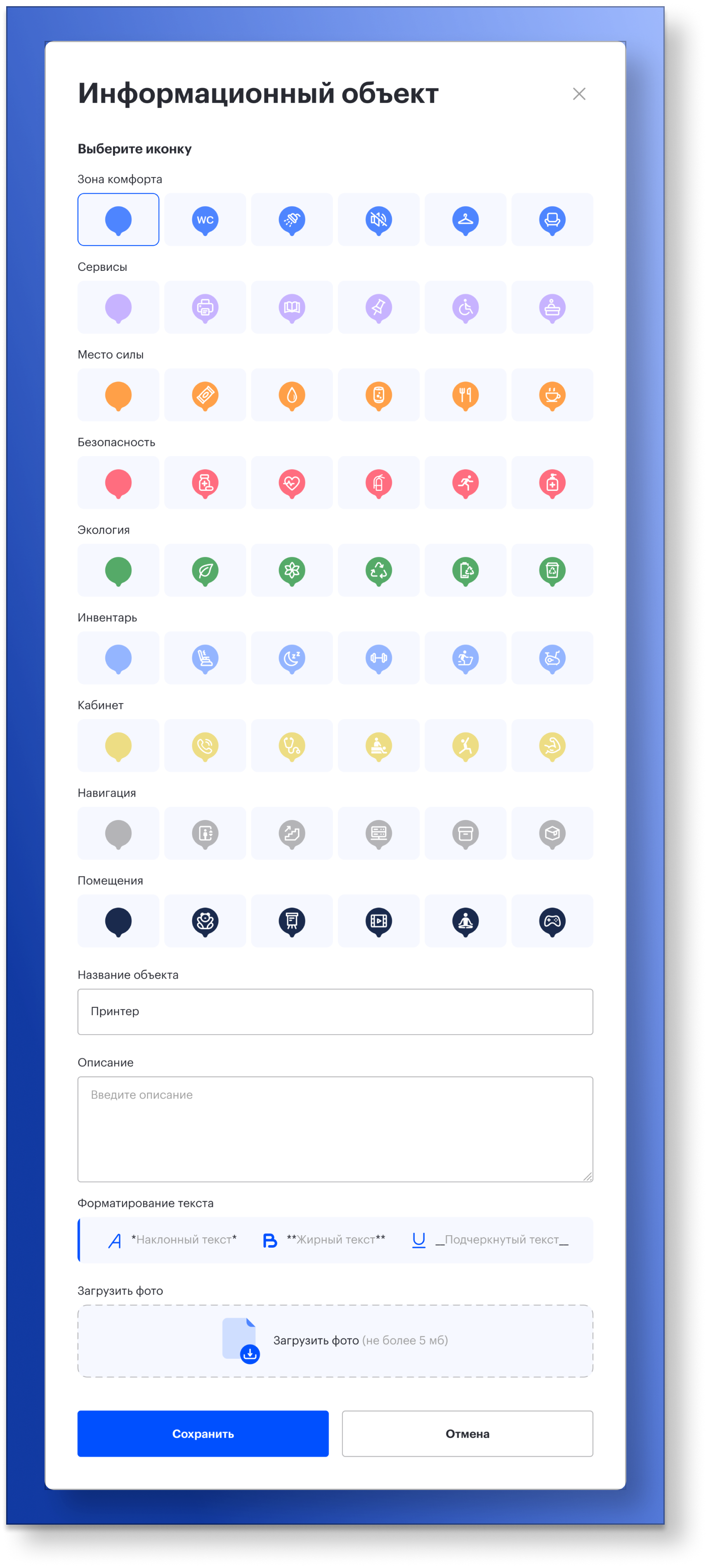 Сделали работу с объектами на карте удобнее: обновили окно добавления и редактирования POI (точки интереса) и расширили набор иконок для обозначения пространств и сервисов.