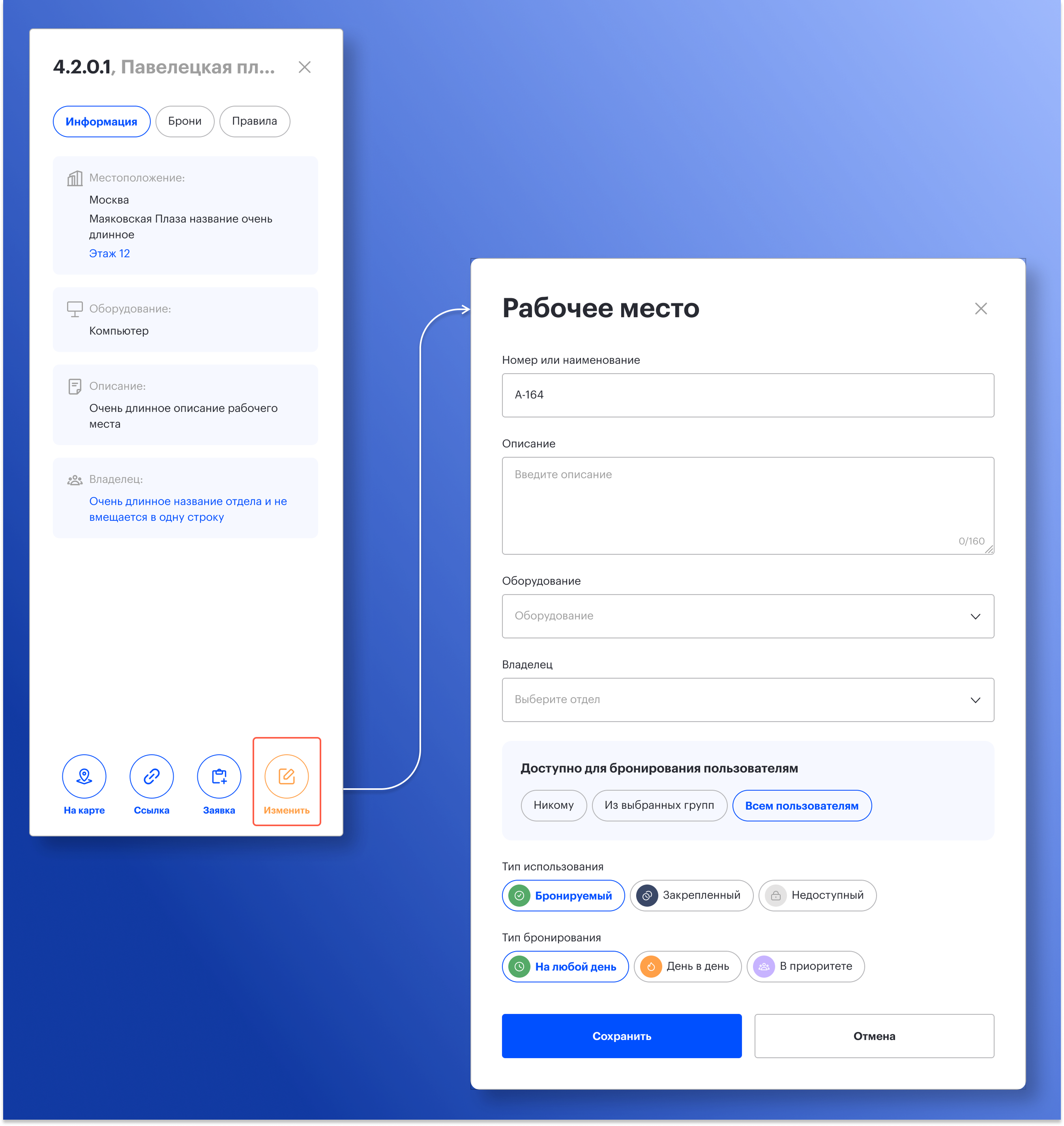 Теперь редактировать рабочие места и парковки можно прямо из карточки объекта, без перехода в редактор карты. Это ускоряет внесение изменений и делает управление пространством удобнее для ответственных лиц.