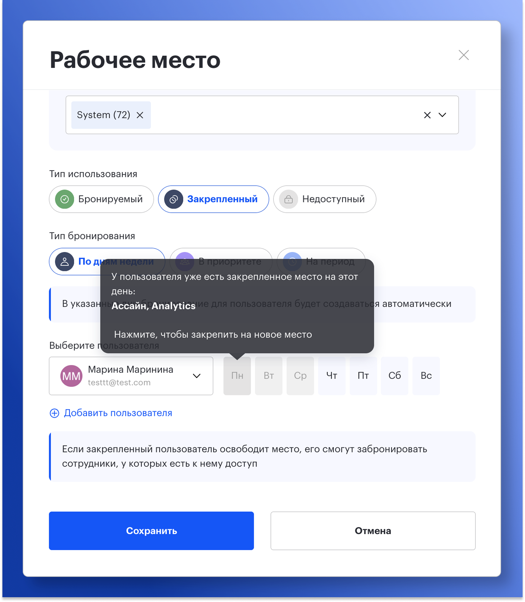При выборе нового места администратор может назначить сотруднику нужные дни недели, даже если на эти дни у него уже есть закрепление. Такие дни больше не блокируются, а лишь подсвечиваются и сопровождаются подсказкой с информацией о текущем закреплении.