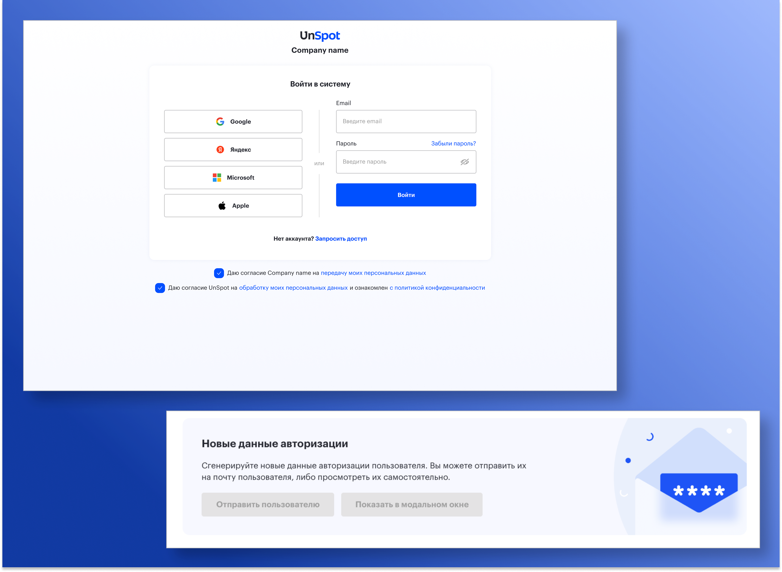Обновили экран входа в систему, чтобы сделать процесс авторизации более понятным, удобным и безопасным. Интерфейс учитывает доступные способы входа: SSO, форму логина и пароля или отдельный сценарий входа для администраторов — в зависимости от выбранной конфигурации.