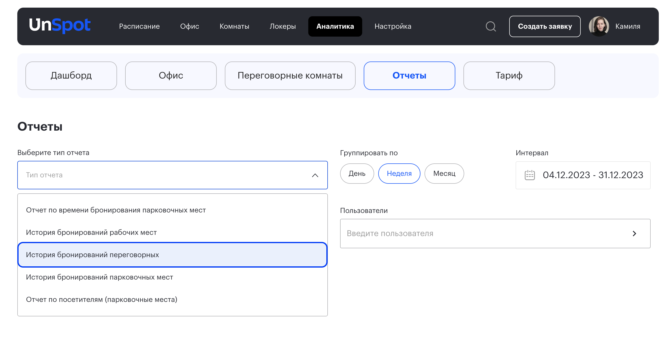 Появился новый отчет История бронирования переговорных, позволяющий отслеживать: