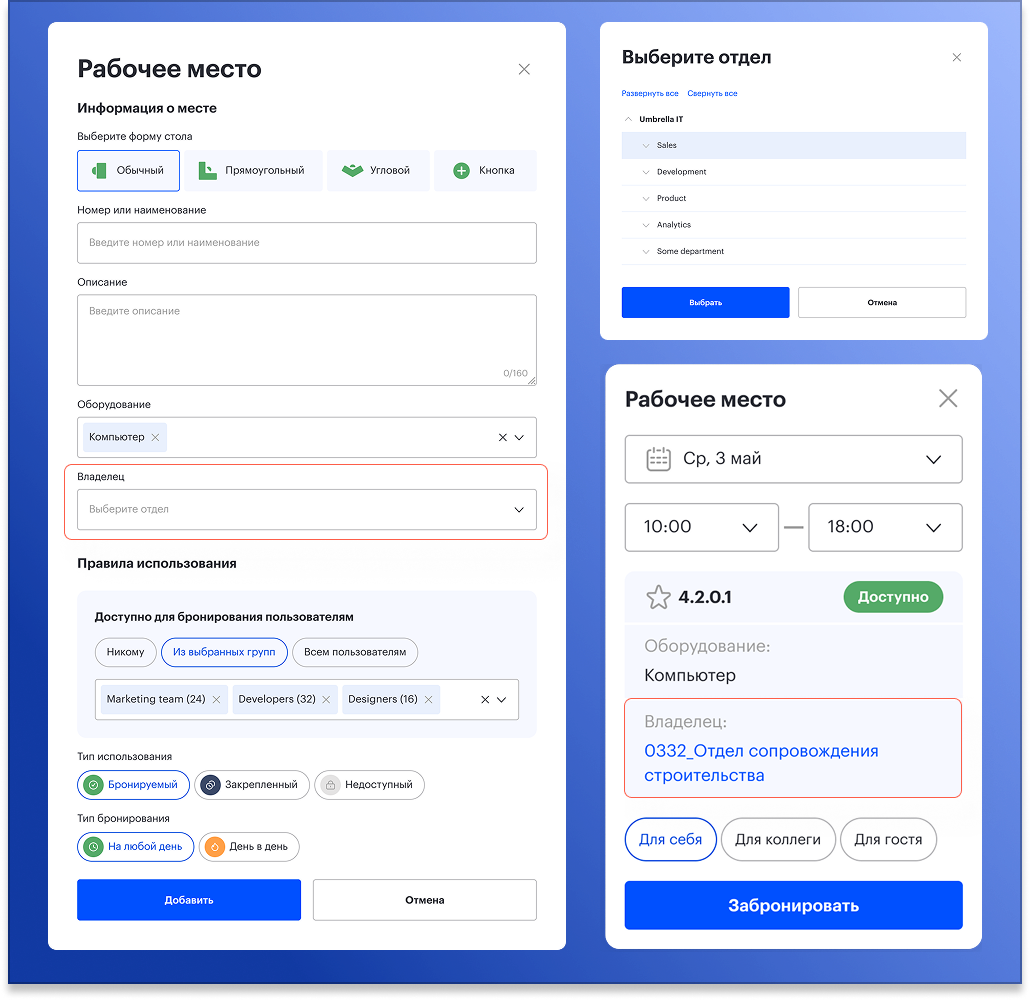 Теперь администраторы могут задавать отдел при создании или редактировании рабочих мест и парковок. При копировании объектов привязка сохранится автоматически, а также для удобства реализовано массовое редактирование: отдел можно задать сразу для группы столов или парковок, без необходимости редактировать каждое место вручную. Информация об отделе отображается в тултипах для столов и парковок, а по клику открываются детали отдела.